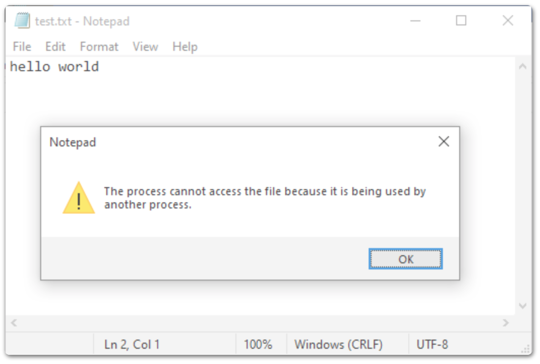 ◦ 터미널 등에서 명령어를 이용해 메모장을 열고, close 하지 않은 상태에서 메모장 파일을 마우스 클릭으로 실행해보면