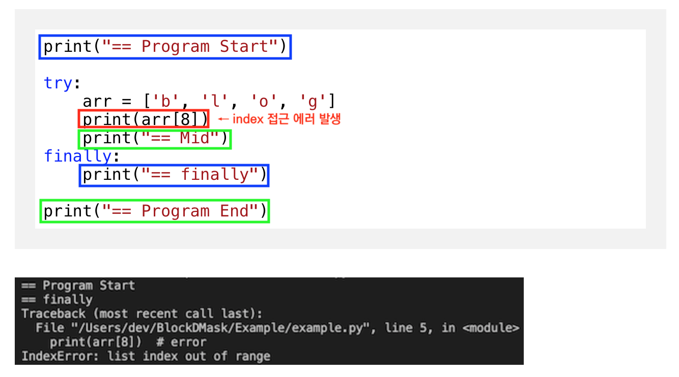 • 특히 예외는 try 블록과 finally 블록 모두에서 발생할 수 있는데, 위 예시에서 기기에 문제가 생기는 경우