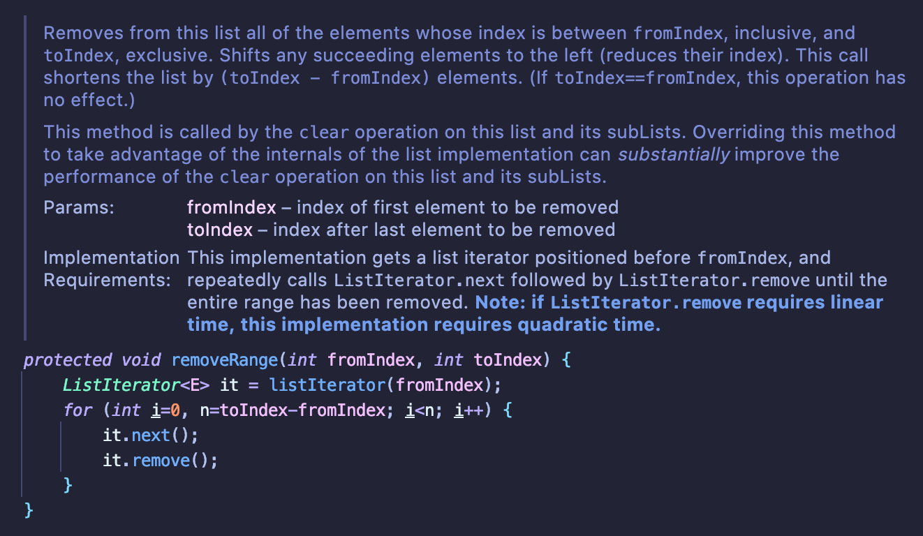 • removeRange 메서드는 특정 리스트 또는 부분 리스트의 clear 메서드에서 사용된다고 나와있다.