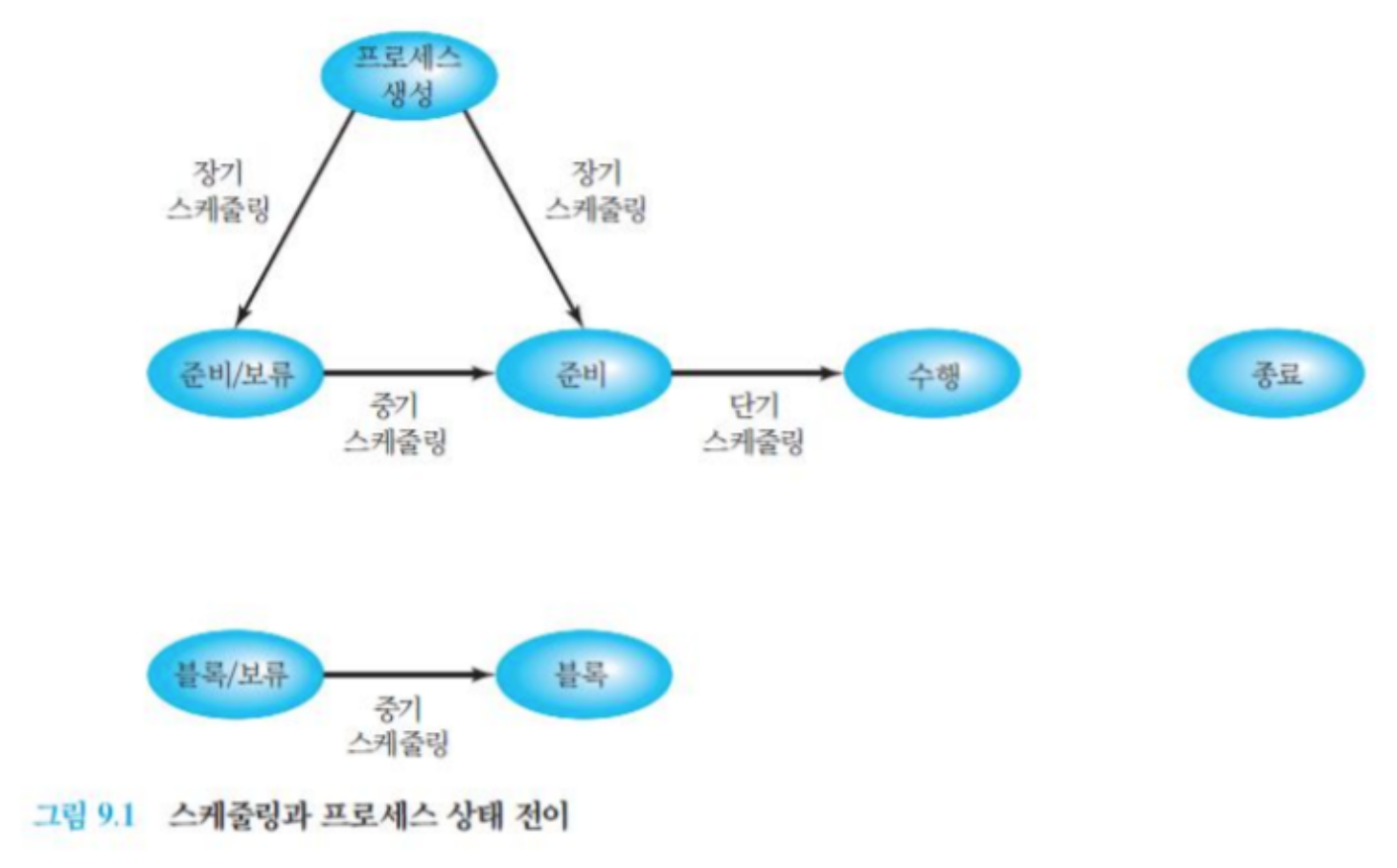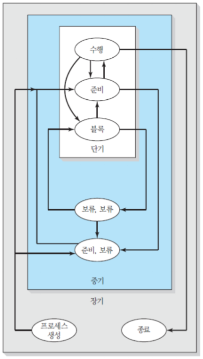 ◦ 요즘은 하드웨어가 발달해 메모리를 신경 쓸 필요가 없어졌다. 프로세스가 시작되면 장기 스케줄링을 거치지 않고 바로 메모리를