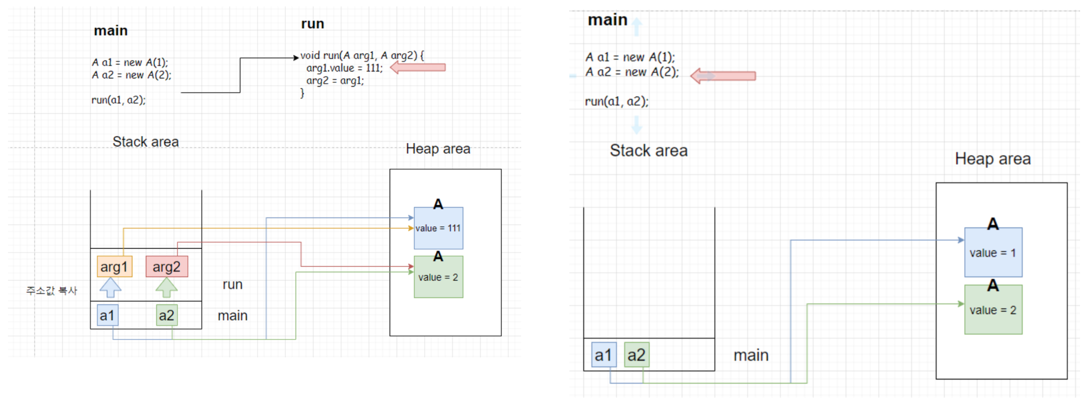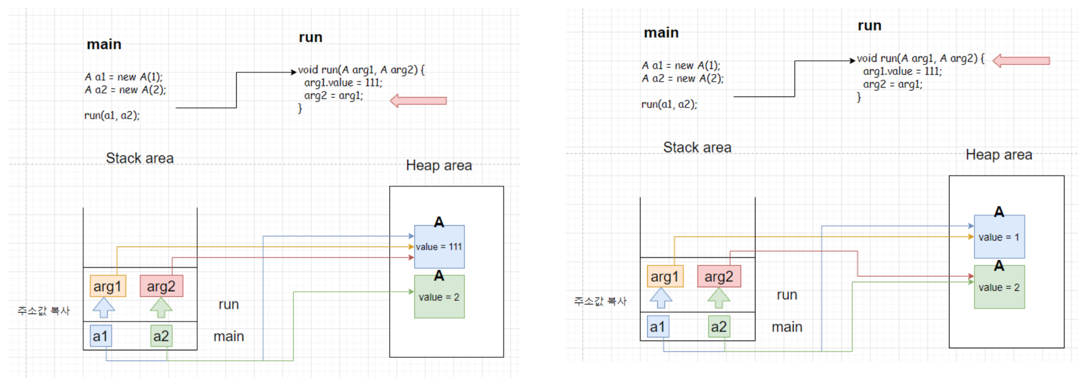 • arg2 = arg1 을 수행해도 이는 run 메서드 내에 존재하는 arg2가 arg1이 가진 주소값을 복사하여 저장하는 것일 뿐,